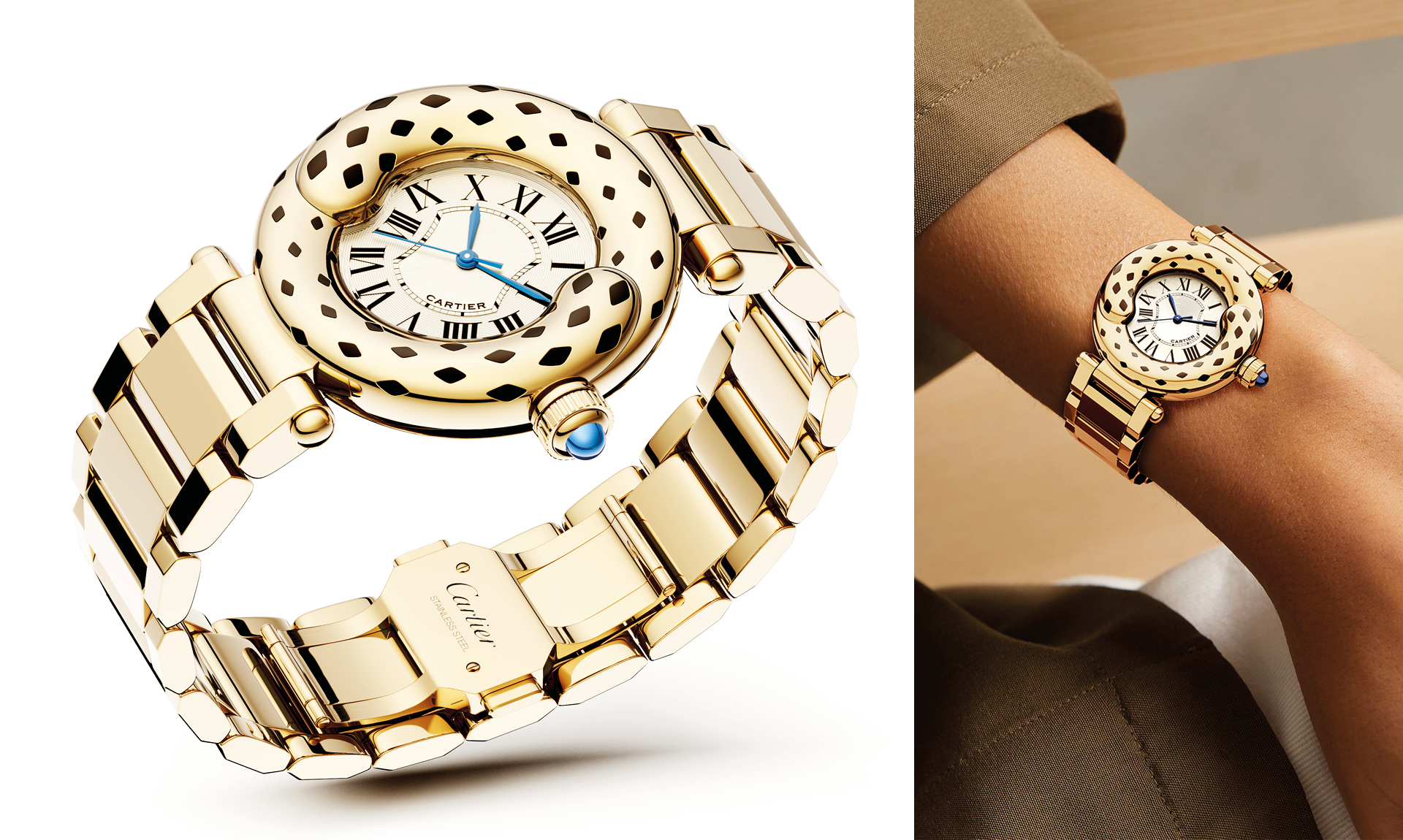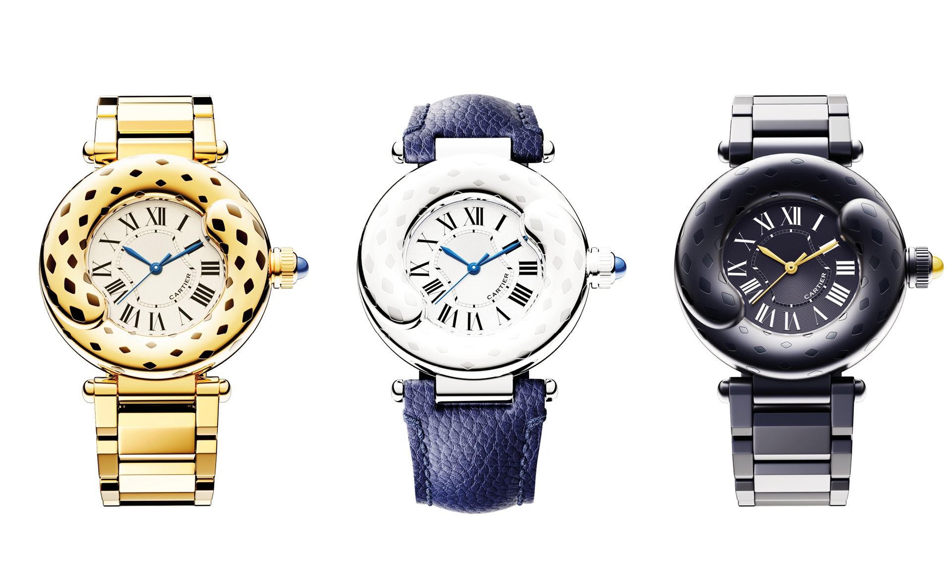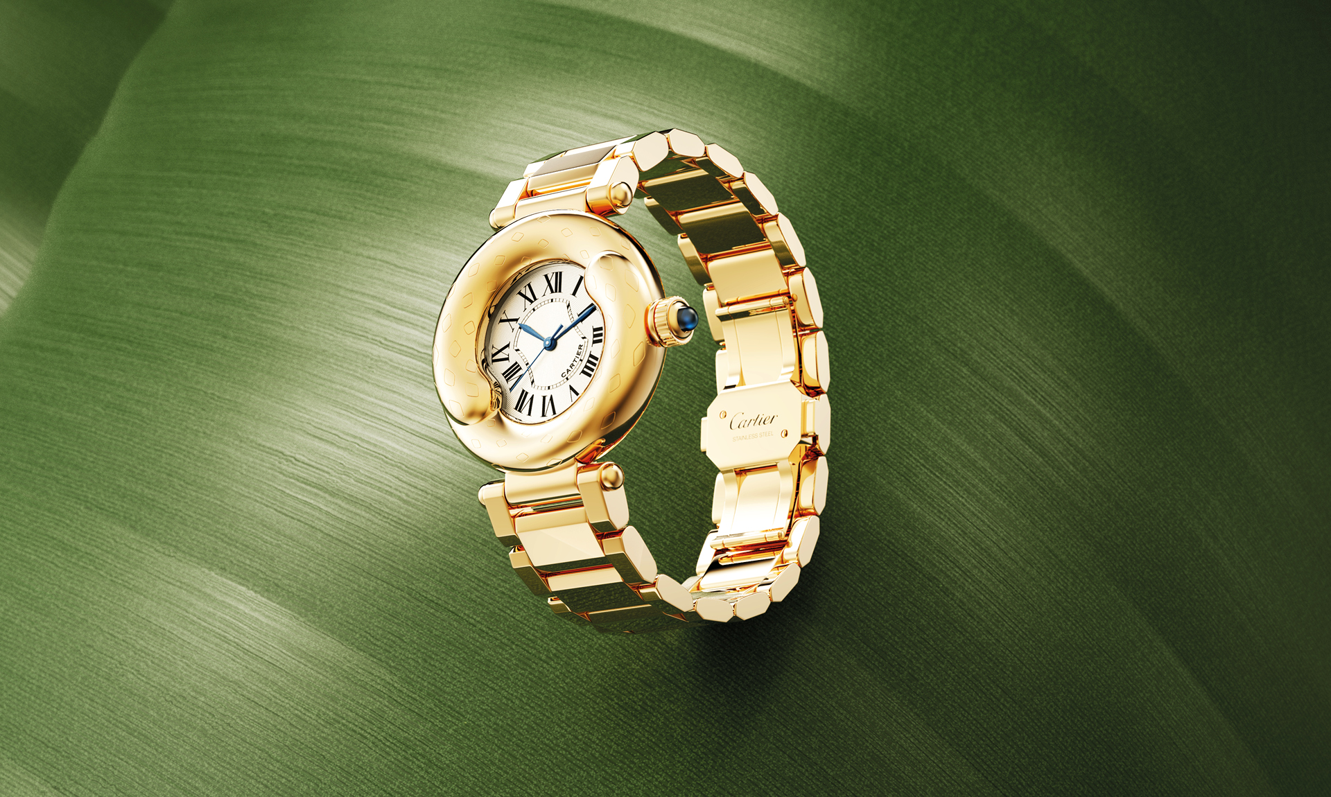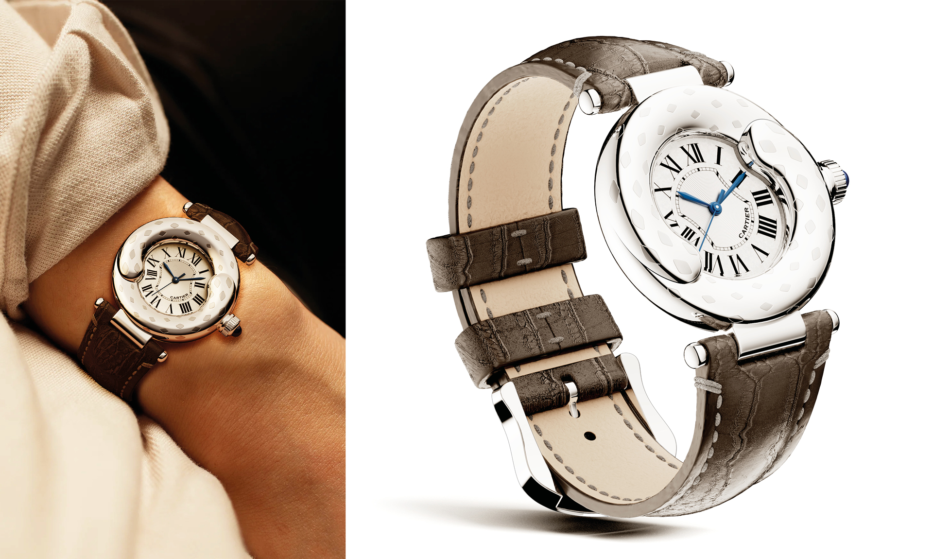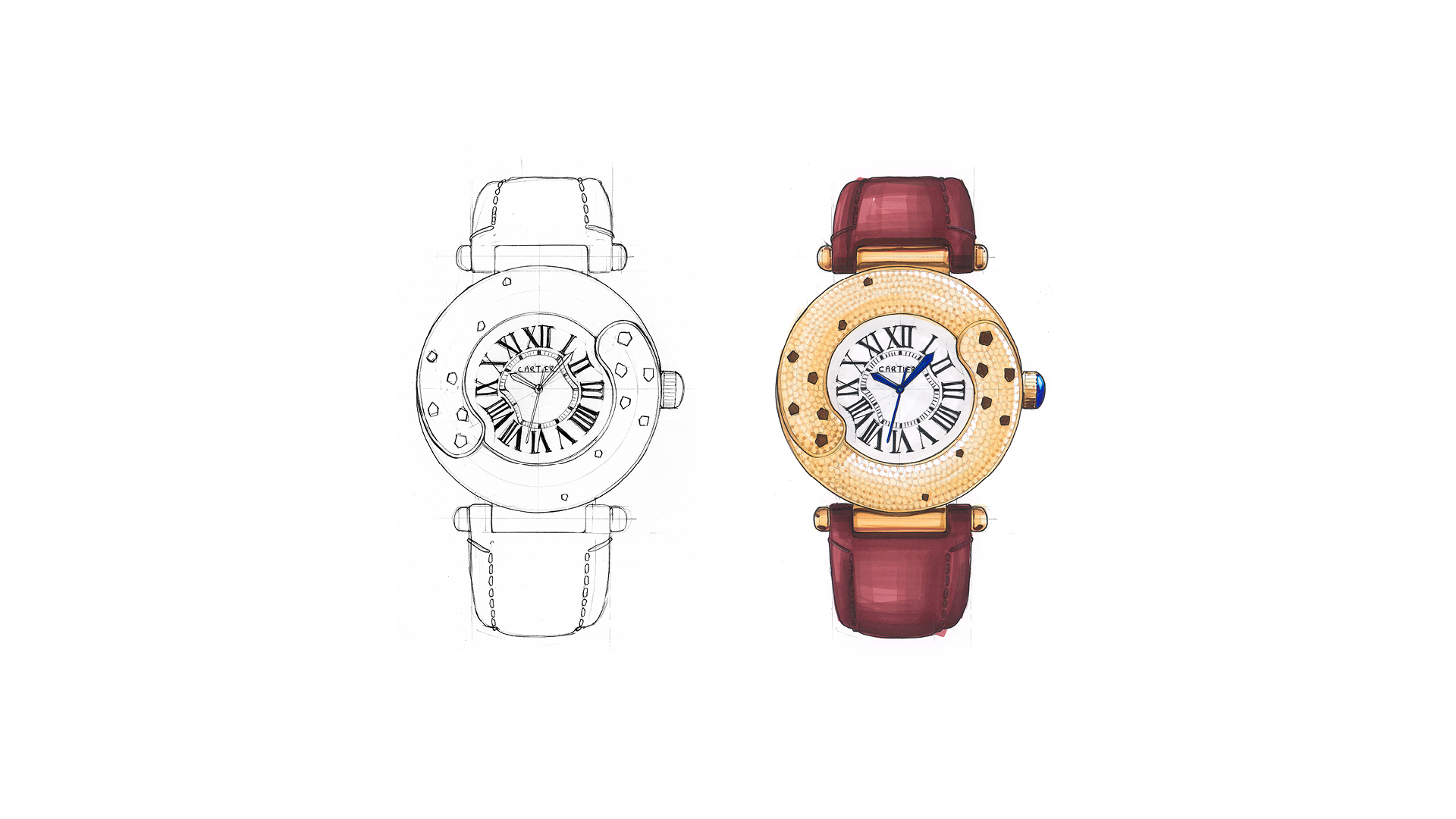 This is a concept design inspired by Cartier, that expresses the roundness and generosity of the Panther’s tail, the emblem of the brand. Represented by a double tail extending over the center, the case highlights the elegance of the Panther’s movement. It inspire balance and wisdom, also evoking a well-known symbol of Eastern philosophy. The central design naturally follows this movement. It can be worn on the wrist of both women and men.